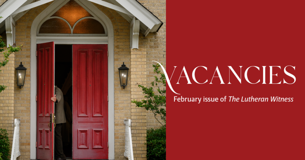 This issue of The Lutheran Witness takes up the topic of vacancies. John Zimmerman discusses how vacant congregations remain a part of the church (p. 12). Heather Williams provides 10 pieces of advice for vacant congregations (p. 14). Brady Finnern reflects on the call process (p. 16). Mary Henrichs introduces a new Bible study that helps congregations examine their place in God’s mission (p. 18). Harold Senkbeil reflects on the natural lifespan of all things in this world, including congregations (p. 20). In preparation for this issue, I spoke to several district presidents, circuit visitors, vacancy pastors and laypeople about vacancies and how congregations can weather them well. I have summarized what I heard from them on p. 8–11. Among it all was one constant refrain: Christ is the Lord of the church, and He holds you always in His tender care. No matter what the numbers may look like, we can take heart — He will never let the testimony of His Word pass from the earth.