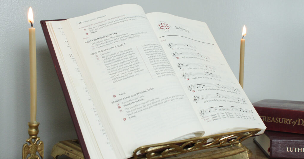 In a family’s living room, a small two-tiered shelf holds several hymnals. A white cloth covers the top with a Bible and two candles resting upon it. A simple crucifix hangs above. The area is modest and unobtrusive, yet each evening the father lights the candles and leads his family in Evening Prayer from Lutheran Service Book, followed by hymns such as “Now Rest beneath Night’s Shadow” and “O Gladsome Light, O Grace.”
